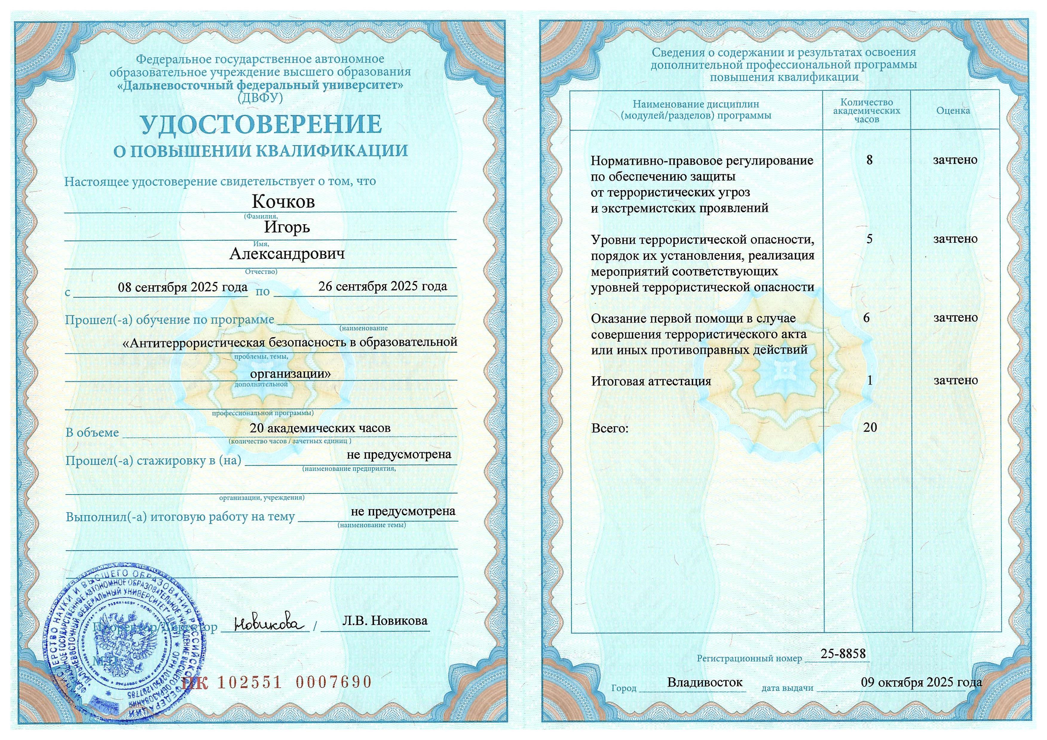| ДВФУ, г. Владивосток, 08.09.2025-26.09.2025, "Антитеррористическая безопасность в образовательной организации", 20 ч, (рег. номер 25-8858). |